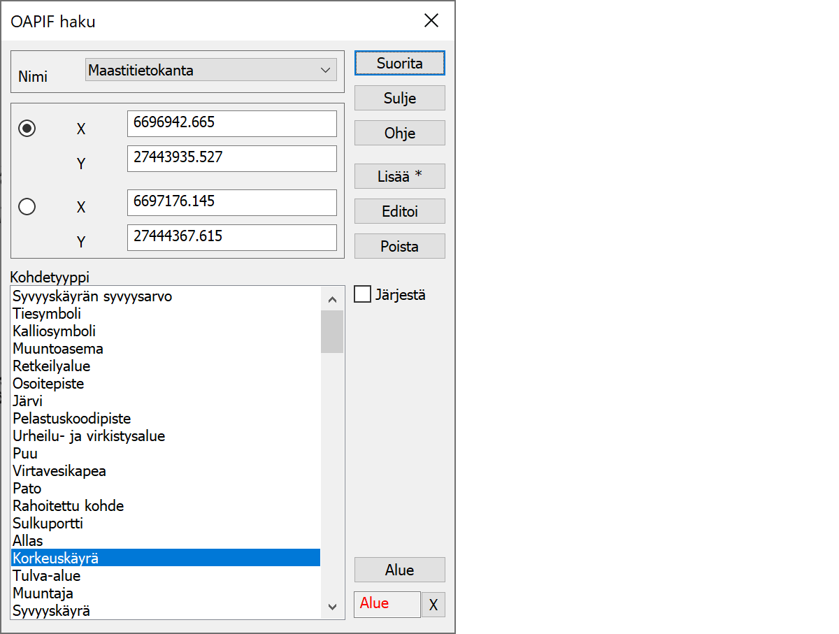 Lista palvelun kohdetyypeistä, jotka tukevat asetuksissa valittua koordinaattijärjestelmää. Listasta valita useita kohdetyyppejä Shift- tai Ctrl-näppäinten kanssa.