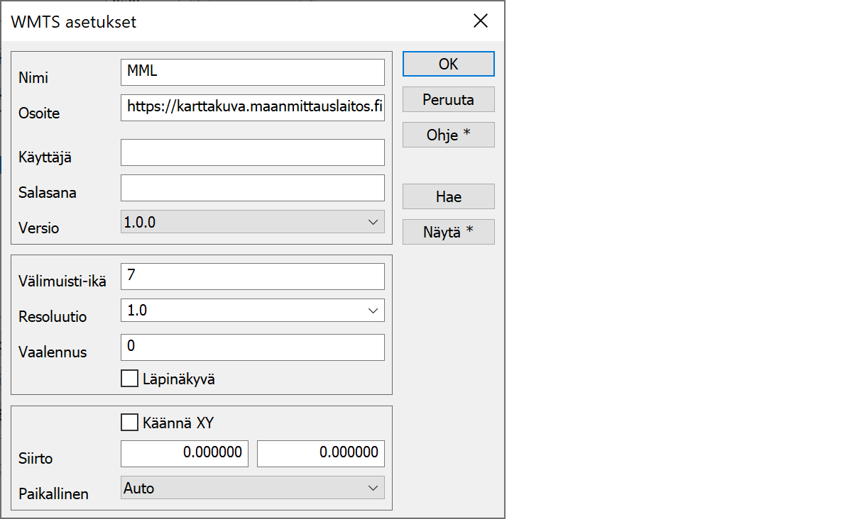 Paikallinen koordinaattijärjestelmä määrää käyttäjän koordinaattijärjestelmän. Oletuksena se on tyhjä jolloin käytetään suoraan palvelun koordinaattijärjestelmää. Muussa tapauksessa annettu alue muunnetaan haussa käyttäjän järjestelmästä palvelun järjestelmään ja palvelun palauttama tiedosto muunnetaan takaisin käyttäjän systeemiin. Auto-vaihtoehto yrittää arvata käyttäjän koordinaattijärjestelmän perustuen yleisten järjestelmien (KKJ, TM, GK) itäkoordinaatin arvoon.