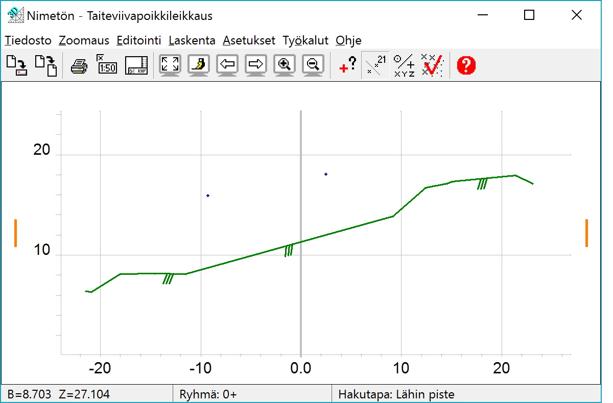 TaiteviivapoikkileikkausOhjelma hakee kaikista käytössä olevista vektoritiedostoista taiteviivat, jotka leikkaavat annetun kohdan. Lisäksi haetaan pinnan 9 pisteet ja taiteviivaosiot ikkunan asetuksissa määrätyn hakuetäisyyden päästä. Jos elementtilistassa on maastomalleja, muodostetaan myös niistä poikkileikkauspinnat. Pienet pystysuorat viivasymbolit lisätään lasketun poikkileikkauksen molempiin reunoihin.
