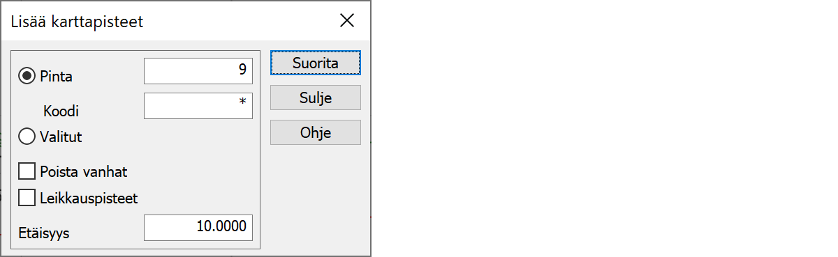 Poistaa poikki- tai pituusleikkauksista vanhat karttapisteet. Pisteiden poisto noudattaa annettuja koodi- ja pinta-asetuksia. Jos haluat poistaa kaikki haetut pisteet, anna Pinta- ja Koodikenttiin * ja Etäisyydeksi 0.0.