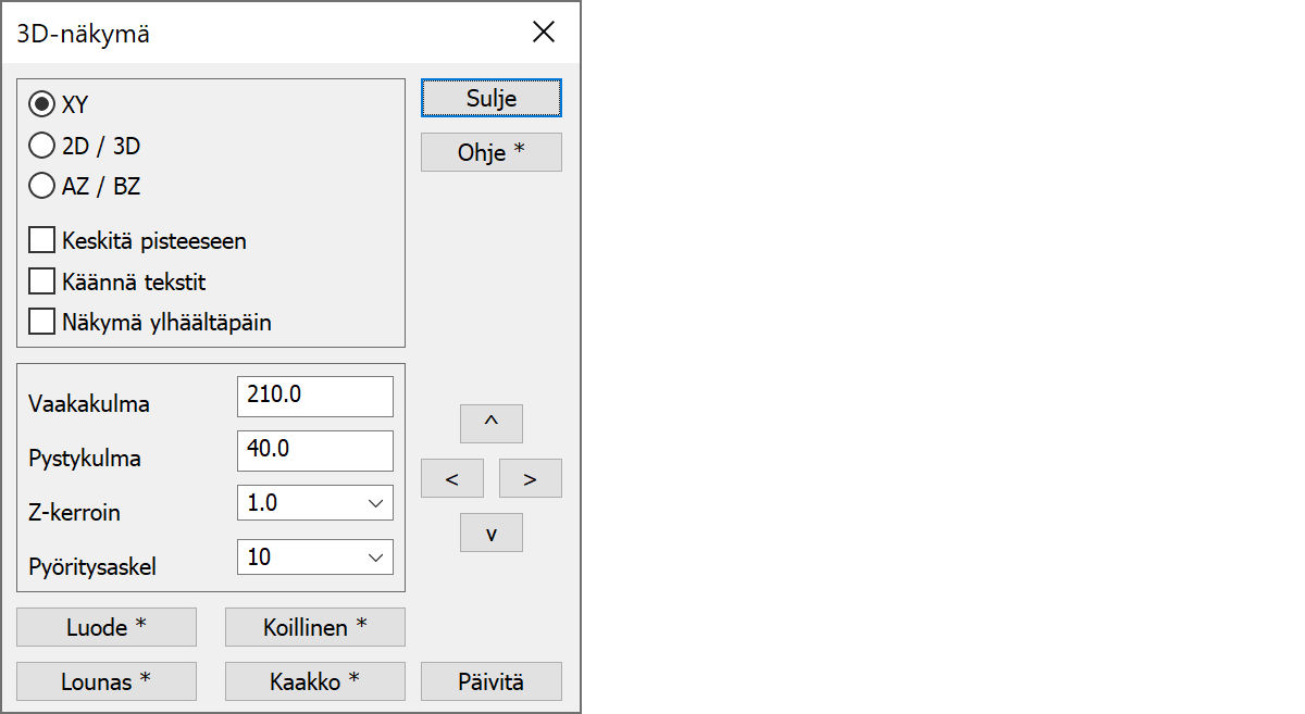 Voit kääntää katselukulmaa nuolinäppäimillä. Ruutu päivitetään jokaisen käännön jälkeen. Kulman käännön voi tehdä myös Alt-nuolinäppäimillä tai Alt-hiirellä.