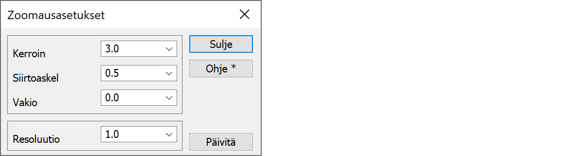 Zoomauksen suurennuksen ja pienennyksen kerroin. Minimiarvo 1.5.