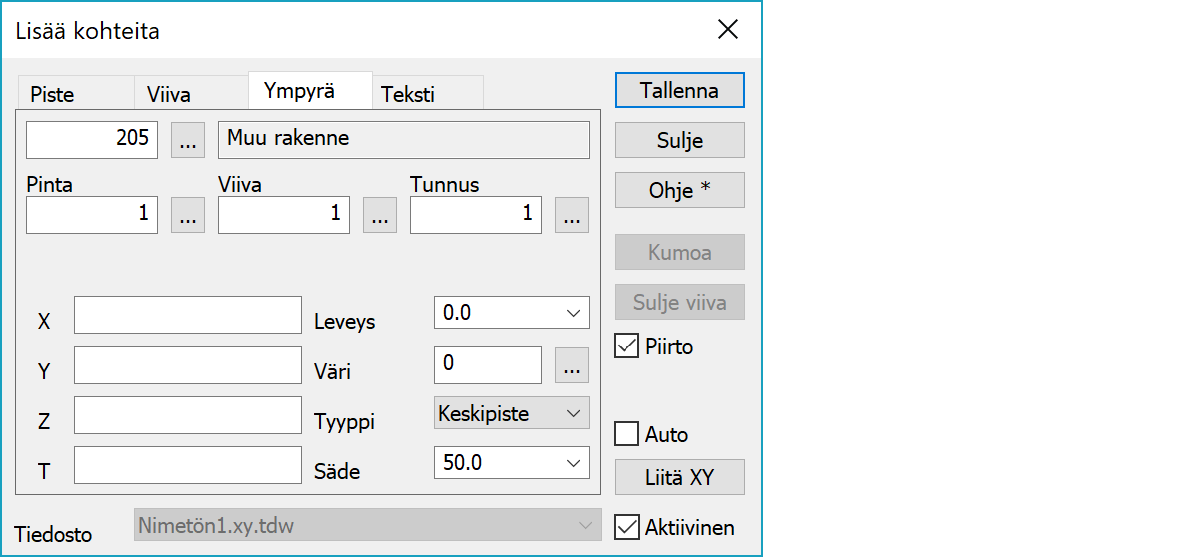 Lisää kohteitaToiminto yksinkertaisten pisteiden, viivojen, ympyröiden ja tekstien lisäämiseen. Kukin sivu muistaa omat asetuksensa ja hakutapansa. Pisteitä ja tekstejä voidaan lisätä automaattisesti yhdella klikkauksella. Viivat ja ympyrät tarvitsevat erillisen tallennuksen lopussa.