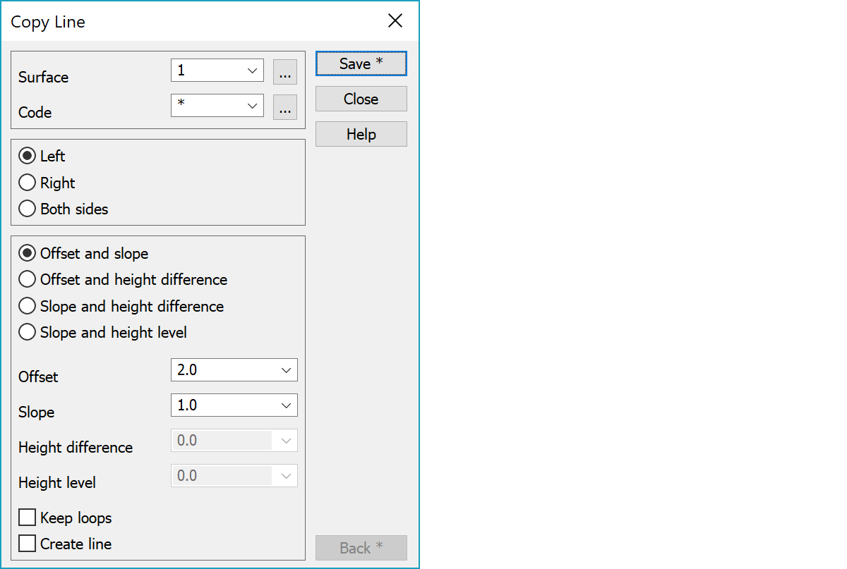 Line is copied to the left, right or both sides. If copying is made to constant height level and original line point heights are both side of this level, first line point determines the left or right side. With side offset zero, only one line is created always.