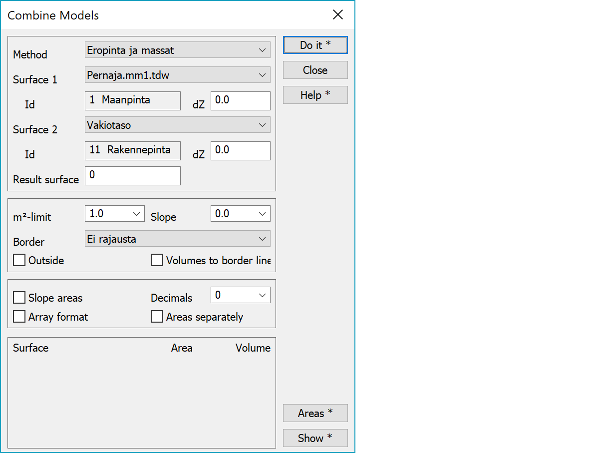 Surfaces can be given in any order. Calculation result is always based on model surface codes. Rules are same as in cross section volume calculation. If there are any problems in combining models, surfaces in lists can be swapped. This changes interal combining order. Same effect can be achieved by pressing Shift-Do it. If the other surface is fixed plane, it is handled as a construct surface (11). However, if the other model is already construct surface, fixed plane behaves as earth surface (1).