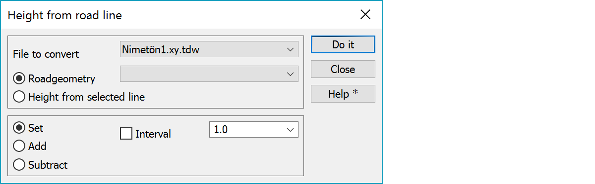 Height from road lineFunction sets, adds or subtracts road line height from the vector file or terrain model.