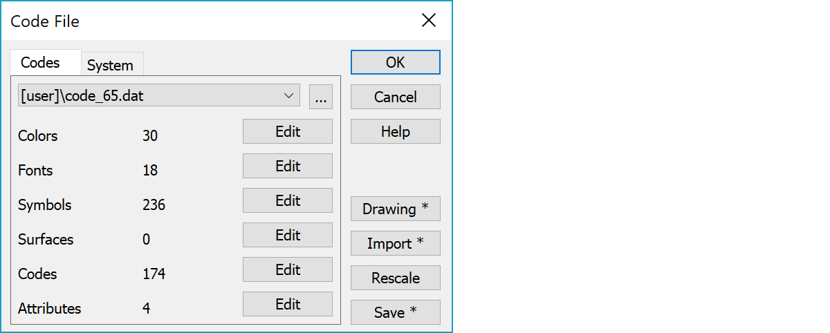 Code fileAll the drawing performed in the program, complies with the instructions given in the code file. The settings for color, font, code, symbols, line types etc. are given here.
