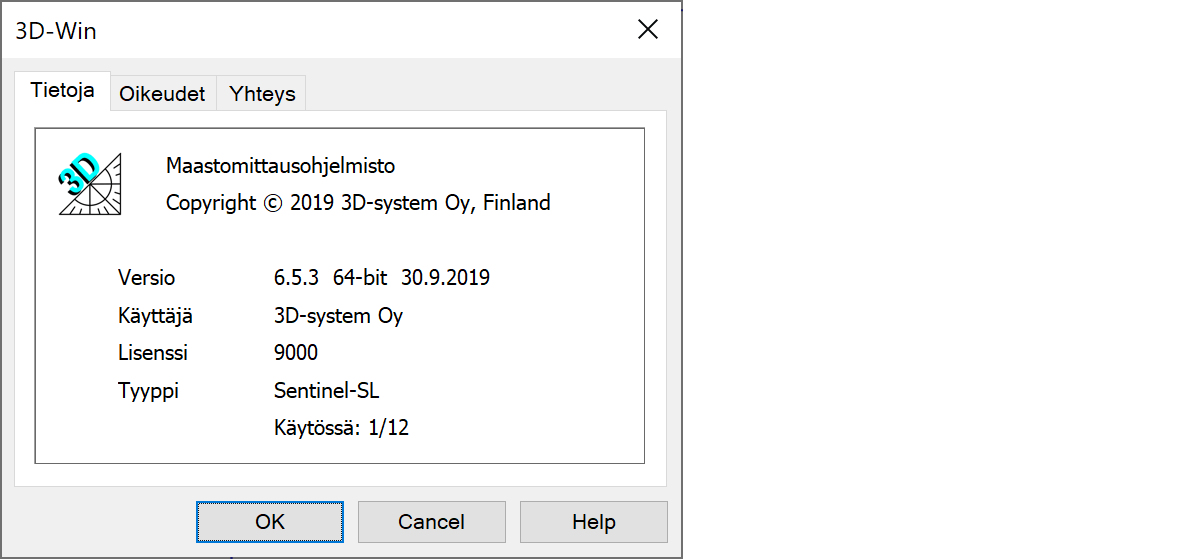 Ensimmäinen sivu sisältää tiedot ohjelman versiosta (versionumero ja päivämäärä), lisenssistä (käyttäjä ja tunnusnumero) sekä lisenssin tyypistä. Lisenssin tyyppi on joko Sentinel-HL (lukkopalikka) tai Sentinel-SL (softalukko).