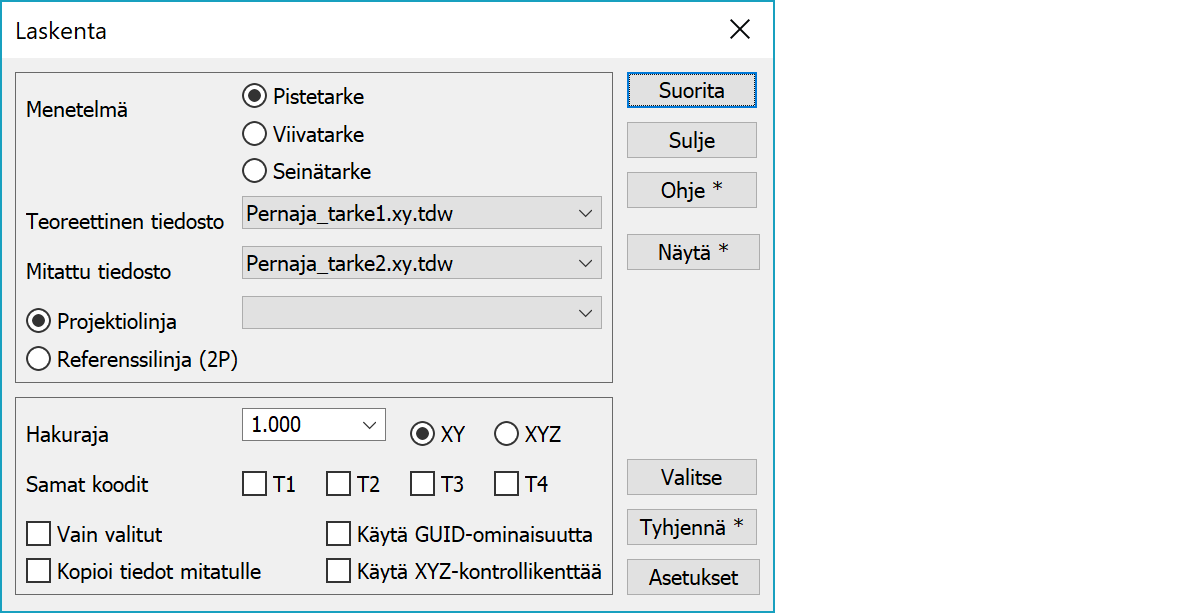 Jos Hakuraja poikkeaa nollasta, vertailuun otetaan vain pisteet, joiden eromitta on tätä pienempi joko XY- tai XYZ-suunnassa valinnan mukaan.