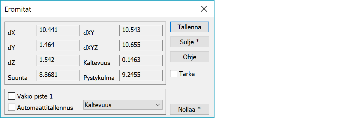 Tallentaa eromitat tarkeominaisuuksiksi alkuperäisille pisteille. Tarkenuolet piirtyvät sen jälkeen tarkemittausten asetusten mukaan.