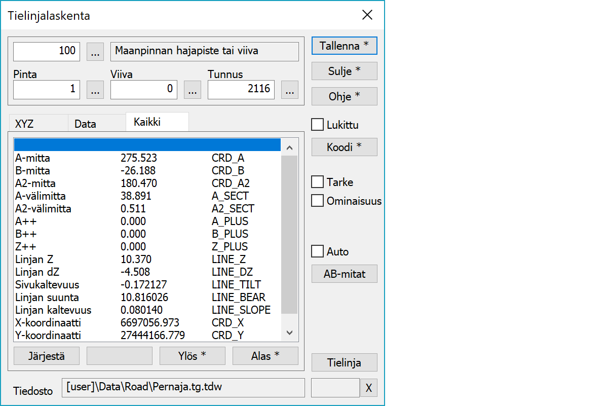 Linjalaskenta vaakageometriasta käyttää referenssilinjana tielinjaa. Osoita ensin vertailulinjana toimivaa tielinjaa. Tämän jälkeen voit joko osoittaa muita pisteitä ja laskea arvoja ruutuun ja tulostiedostoon, tai syöttää dialogin kenttiin arvoja ja laskea uusia koordinaatteja.