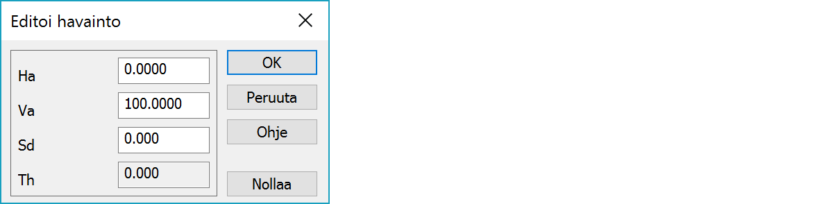 Havainnon vaakakulma, pystykulma, vinomatka ja heijastinkorkeus. Kulmat annetaan gooneina ja matkat metreinä.