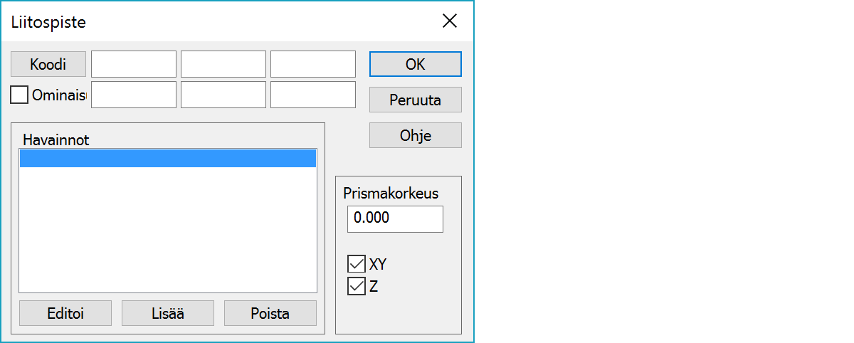 Voit rajoittaa tässä, mitkä koordinaatit kiintopisteeltä voidaan käyttää laskentaan. Tämä koskee vain tunnettua liitospistettä. Jos valitset esimerkiksi vain XY, ei liitospisteen korkeutta (Z) käytetä.