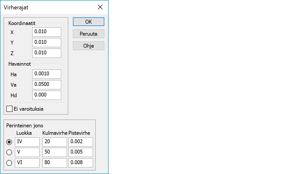 Kullekin koordinaatille voi antaa oman virherajan. Arvot annetaan metreinä.