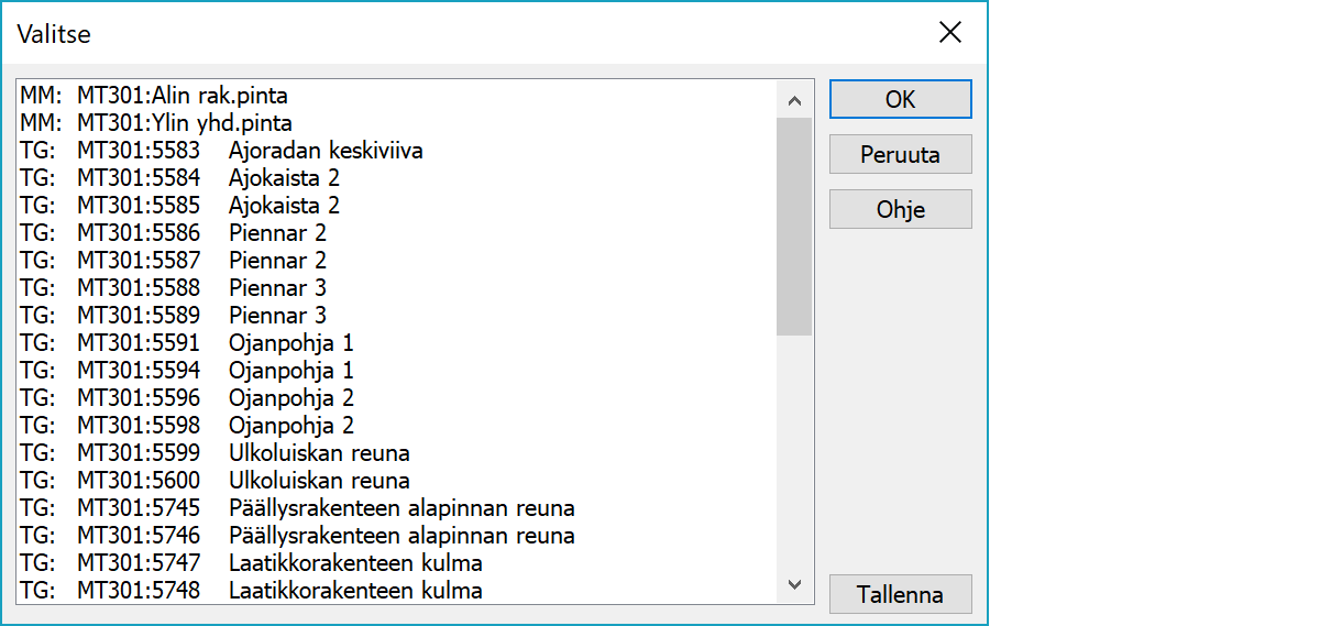 Toiminto kysyy LandXML-tiedoston nimen ja lukee sieltä listan sisällöstä. Kunkin osion nimen edessä näytetään tyyppi: XY vektoritiedostoille, MM maastomalleille ja TG tiegeometrioille. Vektoritiedostoina näytetään mallien lähdetiedot ja putkiverkostot. Maastomalliosiot voivat näkyä listassa kahdesti, sekä vektoritiedostoina että maastomalleina.