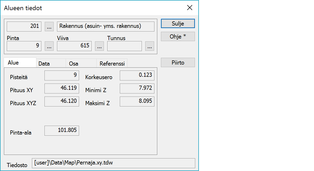 Alueen tiedotNäyttää alueen tiedot. Alue aktivoidaan osoittamalla hiirellä sen sisäpuolta. Jos mahdollisia alueita on useita, aktivoidaan niistä pienin.