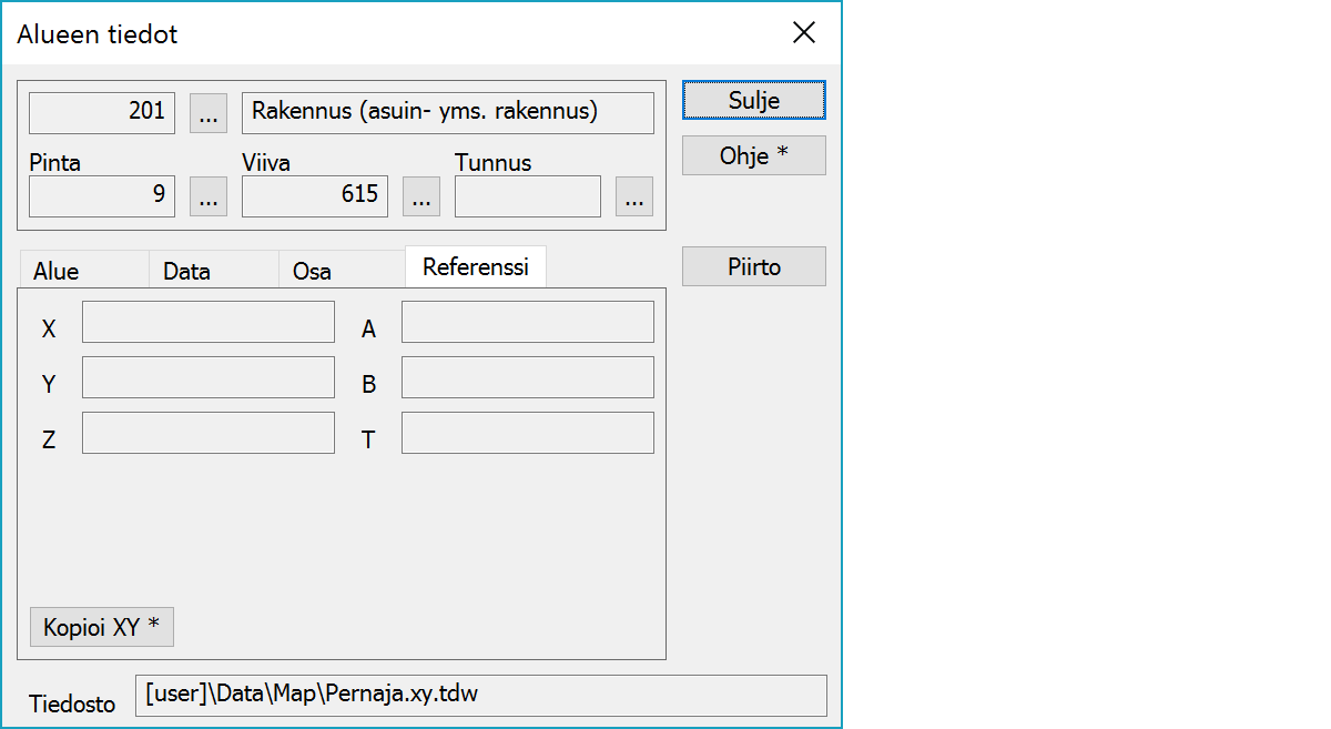 Alueen referenssipisteen koordinaatit. Jos ne on määritelty, alueen ominaisuudet näytetään niissä. Muutoin alueen ominaisuudet näytetään viivan vierellä.
