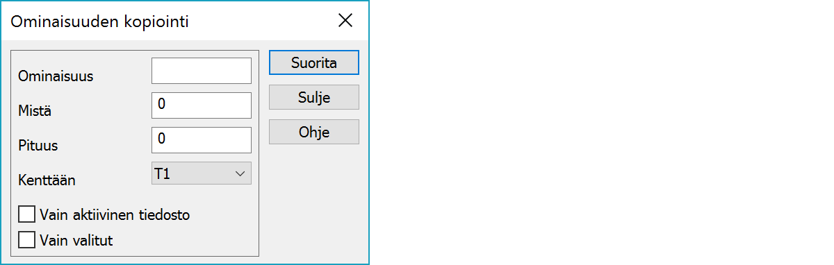 Ominaisuuden kopiointiTiedon kopiointi pisteen ominaisuustiedoista koodikenttiin tai koordinaattiin. Tiedosta voidaan kopioida vain osa lähtien joko ensimmäisestä merkistä tai annetusta kohdasta. Toiminto kohdistuu vain vektoritiedostoihin.