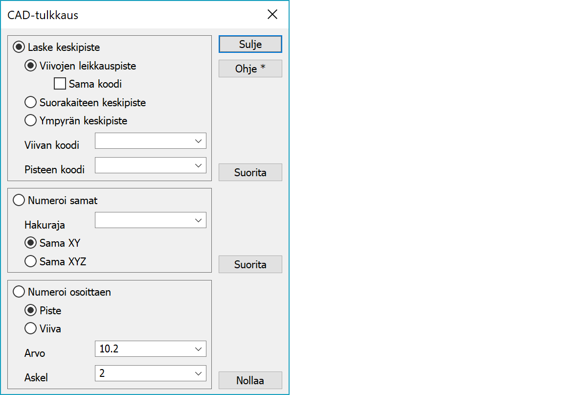 Laskee keskipisteet ympyröille ja tallentaa ne samaan tiedostoon hajapisteinä. Kaarien keskipisteet voidaan laskea Normalisoinnin Kopioi keskipisteet-toiminnolla.