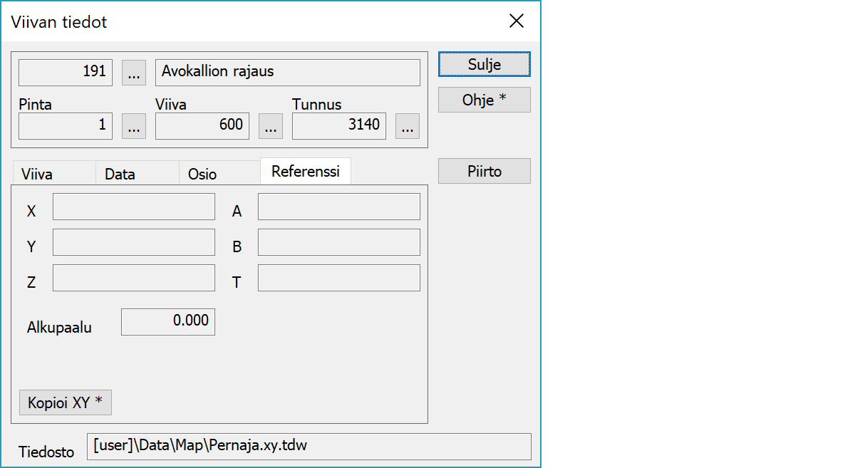 Viivan referenssipisteen koordinaatit. Jos ne on määritelty, viivan ominaisuudet näytetään niissä. Muutoin viivan ominaisuudet näytetään viivan vierellä.