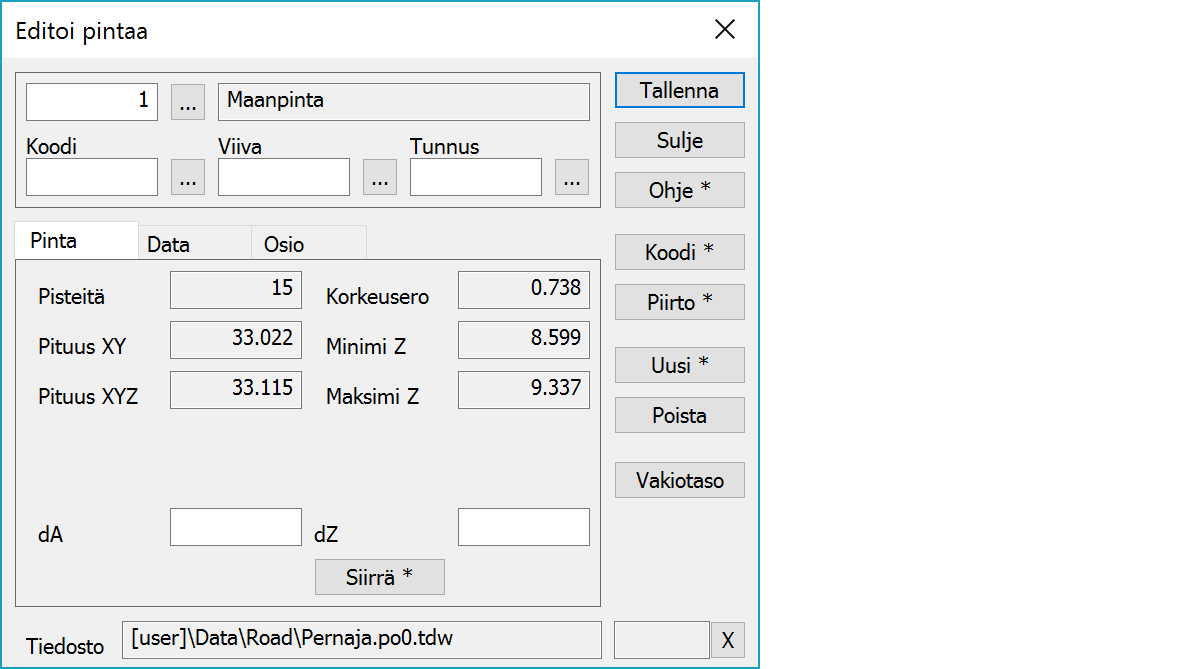 Aktivoi koko pinnan siirtämisen hiirellä. Siirto tapahtuu suhteessa aktiivisen osion loppupisteeseen. Oletuksena vain korkeutta muutetaan. Shift-näppäimen kanssa pintaa voidaan liikuttaa myös sivusuunnassa. Kentät dA ja dZ näyttävät siirron määrän ja niitä voidaan myös editoida suoraan.