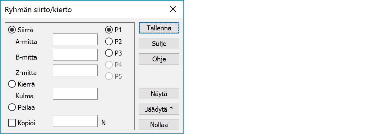 Kun käytetään siirtotoimintoa, pisteillä P1 ja P2 annetaan siirtosuunta ja pisteellä P3 siirron määrä. Määrää voidaan muuttaa A-, B- ja Z-mitoilla.