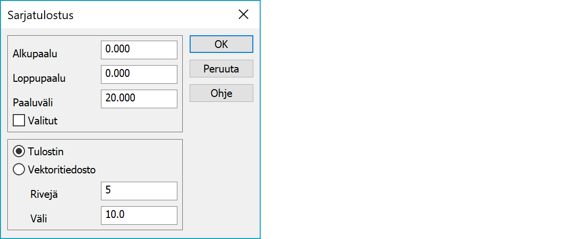 Tulostuksen alku- ja loppupaalu sekä paaluväli