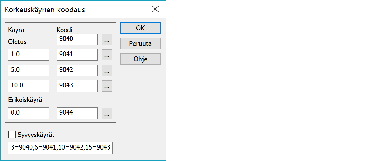 Vaihtoehtoisesti voit laittaa päälle rastin ja sen viereen listan laskettavista korkeuksista ja koodeista: 3=9040,6=9041,10=9042,15=9043. Tällöin vain listatut korkeuskäyrät lasketaan.