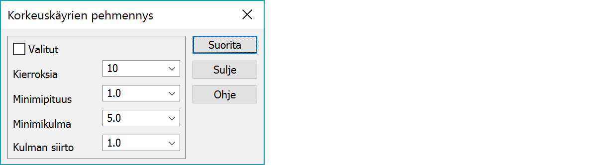 Korkeuskäyrät lasketaan mallista murtoviivoina ja tällä toiminnolla niitä voidaan pyöristää annetuilla arvoilla paremman näköisiksi. Käyrän minimipituus ja kulma voidaan antaa iteroinnin rajaksi.