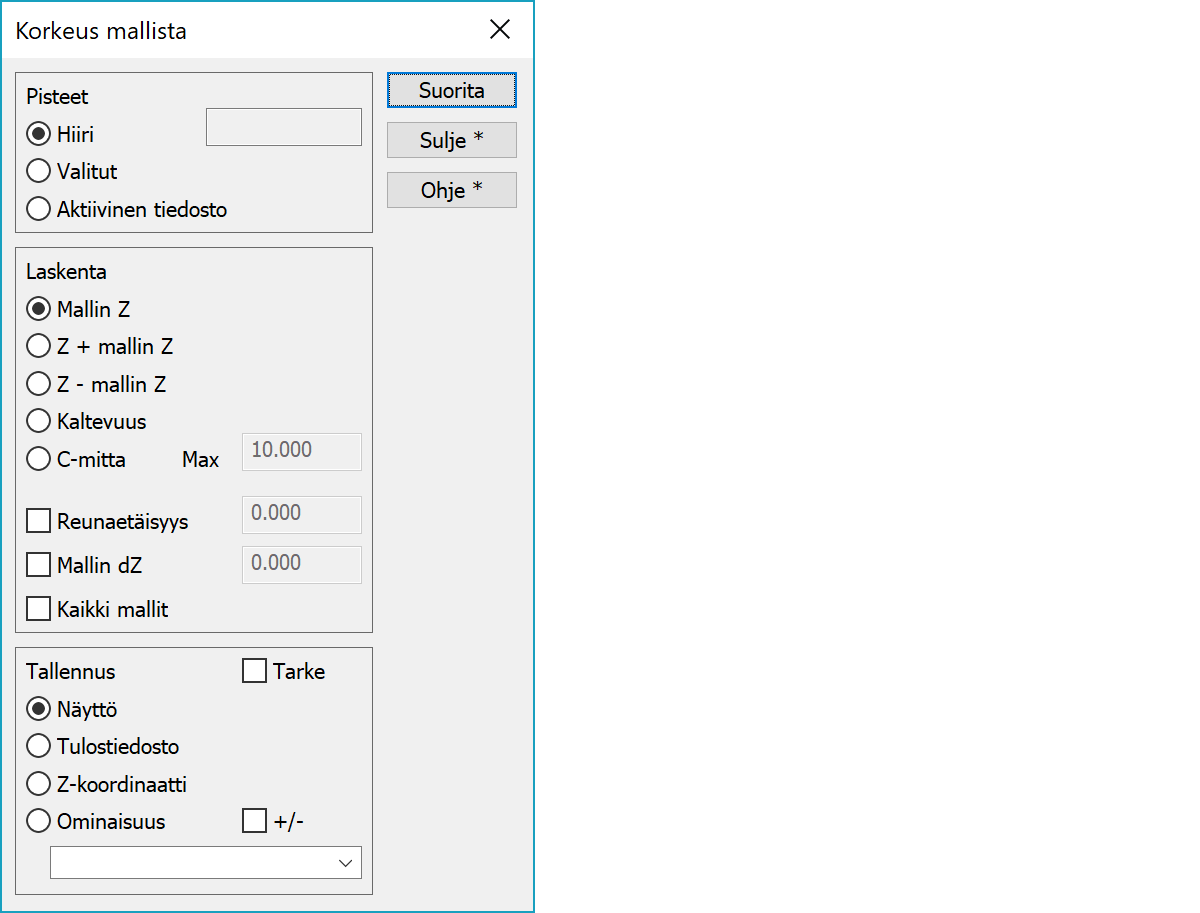 Korkeus mallistaKorkeuden hakeminen maastomallista. Mallina voi olla joko maastomalli tai korkeuseropinta. Voit esimerkiksi nostaa digitoidut pisteet maastomallin tasolle, laskea paalujen katkaisupituudet ylätasosta kalliopintaan tai suorittaa tarkemittausta.