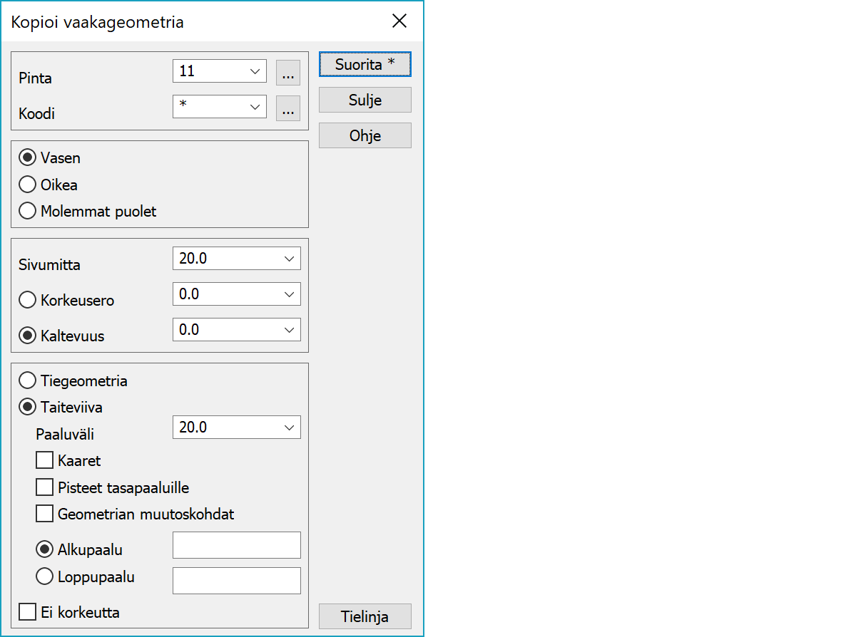 Vaakageometrian kopiointi sivulle joko tielinjana tai murtoviivana halutulla paaluvälillä. Jos kopioit vaakageometrian taiteviivaksi, kirjoitetaan geometrian nimi syntyvän viivan T2-kenttään ja paaluluvut T4-kenttään.