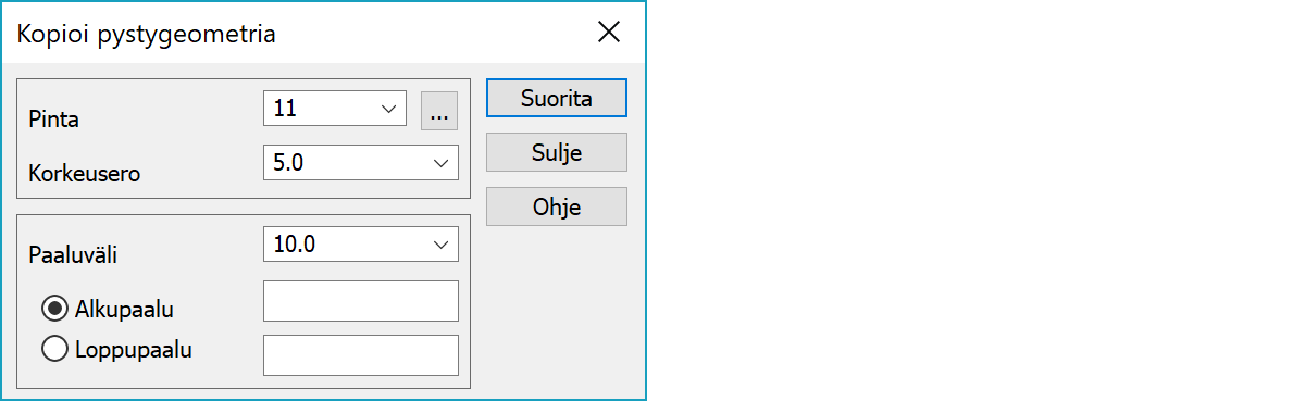 Laskentavälin alku- ja loppupaalu voidaan joko kirjoittaa tähän tai osoittaa hiirellä ruudulta. Hiirellä osoitettaessa paaluluku pyöristetään lähimpään paaluväliin mukaiseen paalulukemaan. Mikäli paaluväliä ei anneta, kopioidaan koko linja.