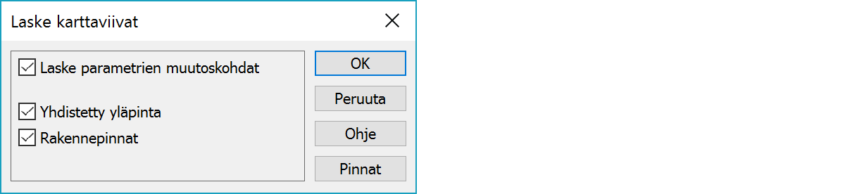Laskee kunkin rakennepinnan viivat erikseen. Pinnat voidaan poimia tiedostosta pintatunnuksen avulla ja käyttää esimerkiksi paalutukseen tai tarkemittaukseen. Pinnat-painike avaa listan, josta voidaan valita laskettavat pinnat. Painike näyttää myös valittujen pintojen määrän suluissa.