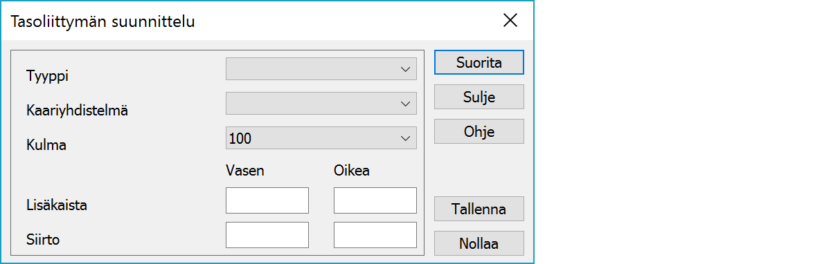 Valitse ensin parametreille arvot ja paina sitten 'Suorita'-näppäintä. Toiminnon tarvitsemat yleiset parametrit annetaan JUNCTION.DAT-tiedostossa, jonka on oltava ohjelman asetushakemistossa.