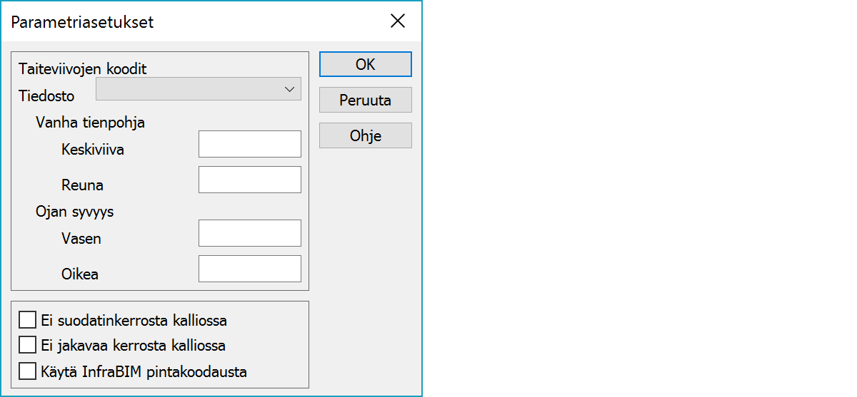 Tiedostosta haettavien taiteviivojen koodit. Vanhan tienpohjan keski- ja reunaviivoista muodostetaan valekallio. Ojan syvyysviivoja käytetään määräämään ojan syvyydet tien vasemmalle ja oikealle puolelle.