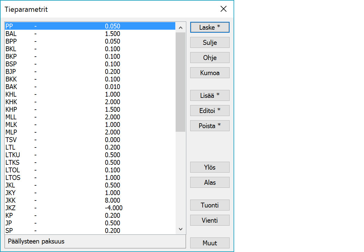 Lista näyttää määritellyt parametrit. Kustakin näkyy lyhenne, mahdollinen paaluväli jossa arvo on käytössä sekä arvo tai muuttuville parametreille alku- ja loppuarvo. Alareunassa näytetään aktiivisen parametrin koko nimi.