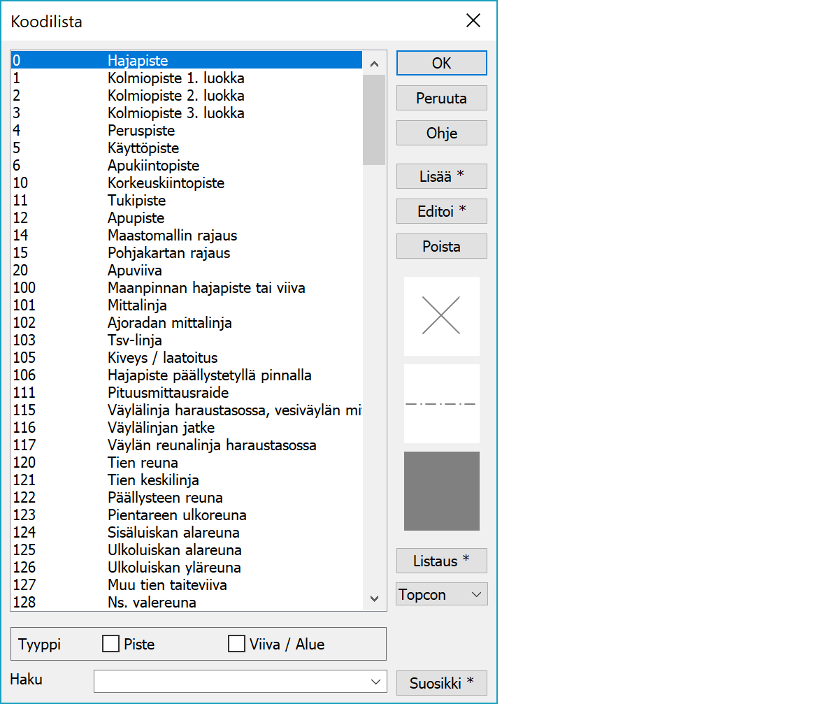 Listassa näkyvät ao. koodilistaan määritellyt koodit. Alareunan kentät näyttävät koodin symbolin sekä viiva- ja aluetyypin. Koodilista voidaan määrätä kentille T1 ja T3. Kentän T1 määrittelyt määräävät piirtosäännöt poikki- ja pituusleikkauskuvissa pintatunnuksen mukaan ja kentän T3 määrittelyt vastaavasti normaalikuvan piirtosäännöt koodin mukaan.