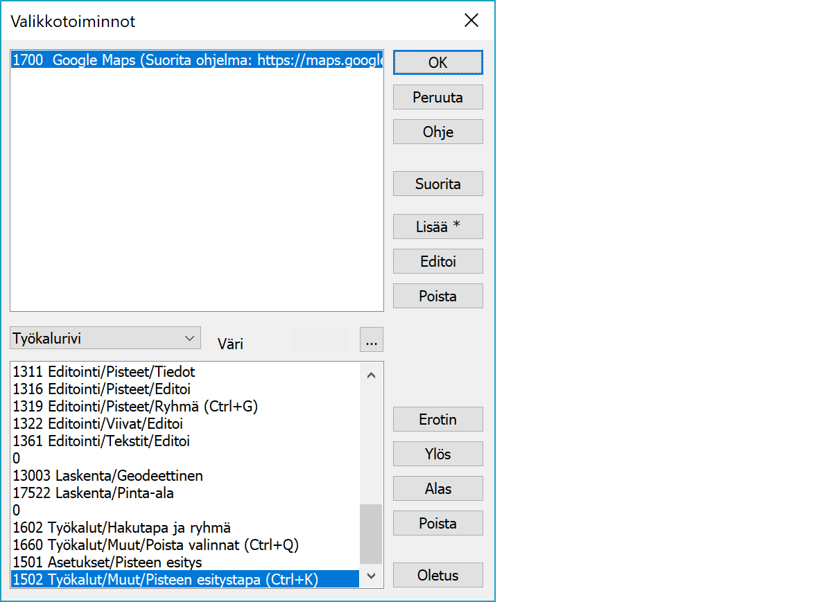 Valikkotoiminto voidaan luoda suoraan aputoimintolistojen (viivatyökalut, maastomallityökalut, lisätoiminnot, aputoiminnot) Valikko-painikkeella.