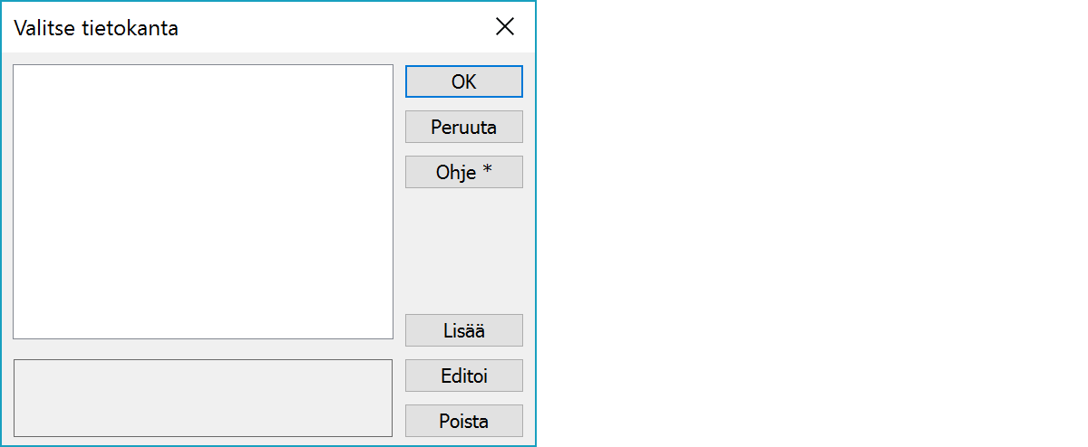 Valitse tietokantayhteys listasta. Käyttäjä voi lisätä listaan uusia yhteyksiä. Yhdellä rivillä on yhteys yhteen tietokantaan halutuilla asetuksilla. Samaan tietokantaan voi olla useita erilaisia yhteyksiä. Lista järjestetään nimen mukaan.