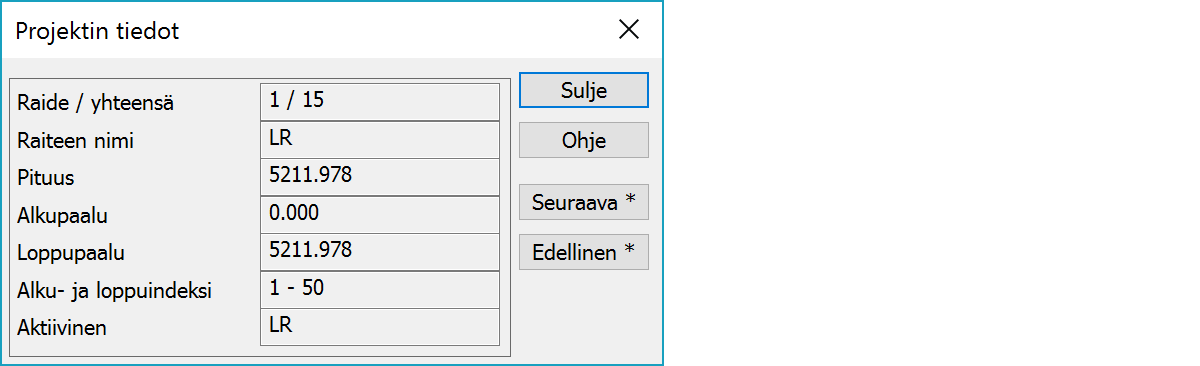 Näyttää seuraavan tai edellisen raiteen tiedot. Shift-näppäimen kanssa näyttää projektin ensimmäisen tai viimeisen raiteen tiedot. Alt-näppäimen kanssa näyttää kaikkien elementtien tiedot txt-listauksena.