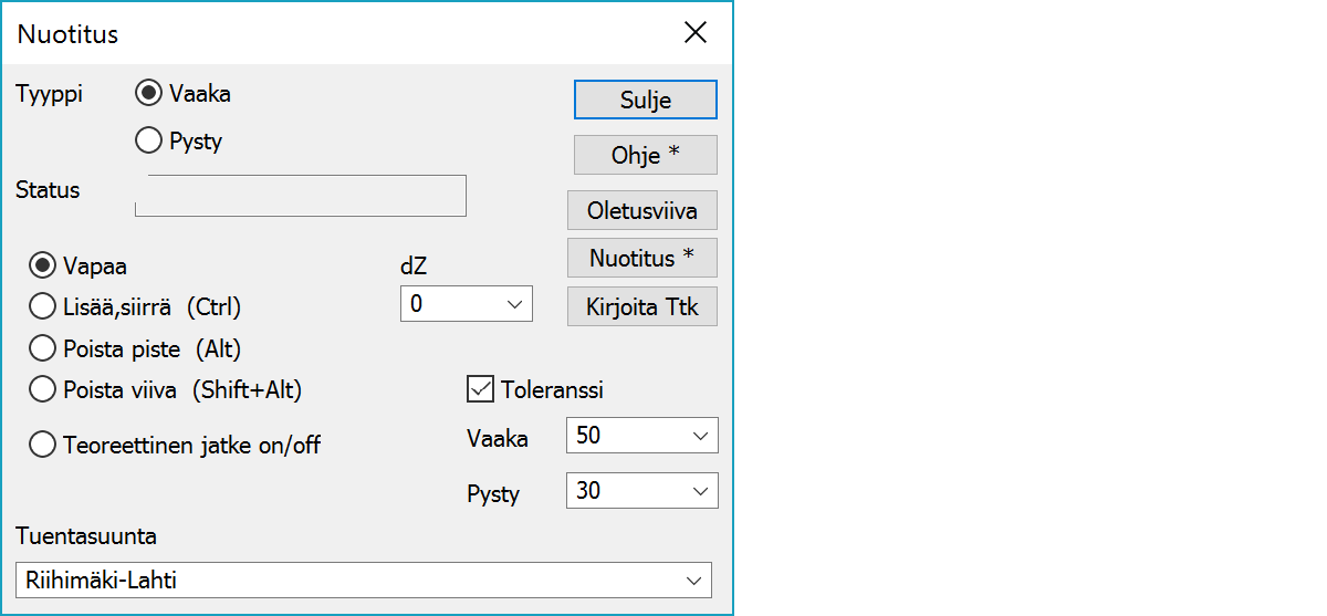 Valitse vaaka- tai pystysuunta editointia varten. Ikkunassa näytetään vain toinen suunta kerrallaan. Pituusleikkausikkunan Z-kertoimeksi kannattaa asettaa 1000 kohdassa Asetukset/Ikkuna. Jos haluat nähdä molemmat suunnat samanaikaisesti ruudussa, sulje Nuotitus-dialogi.