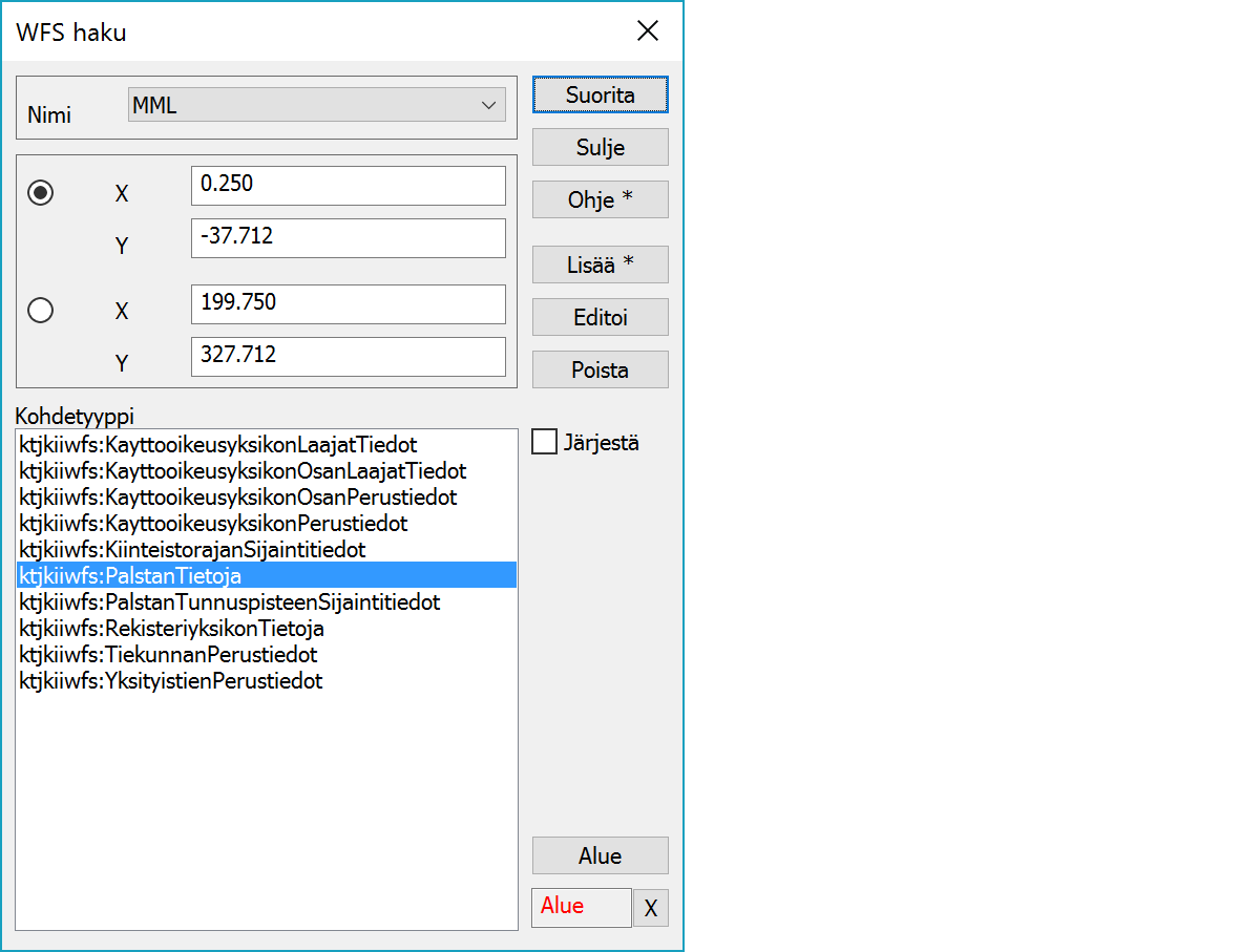 Lista palvelun kohdetyypeistä, jotka tukevat asetuksissa valittua koordinaattijärjestelmää. Listasta valita useita kohdetyyppejä Shift- tai Ctrl-näppäinten kanssa.