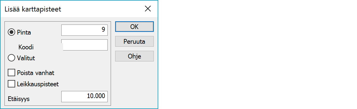 Poistaa poikki- tai pituusleikkauksista vanhat karttapisteet. Pisteiden poisto noudattaa annettuja koodi- ja pinta-asetuksia. Jos haluat poistaa kaikki haetut pisteet, anna Pinta- ja Koodikenttiin * ja Etäisyydeksi 0.0.