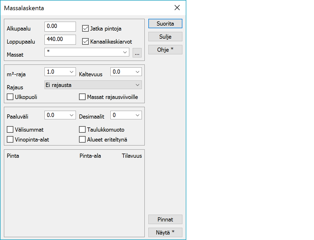 Laskee tulostiedostoon kaikkien pintojen vinopinta-alat. Pinta-ala lasketaan vain kyseisen pinnan massojen alueen yläpinnasta.