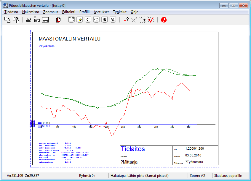 Tielaitoksen vaatimusten mukainen maastomallin vertailu mitattuun tarkistusprofiiliin. Osoita viiva, jolla tarkistusprofiili lasketaan. Toiminto kirjoittaa jokaisen lasketun viivan tiedot myös tulostiedostoon, jonka näet Asetukset-kohdassa Raportti-toiminnolla.