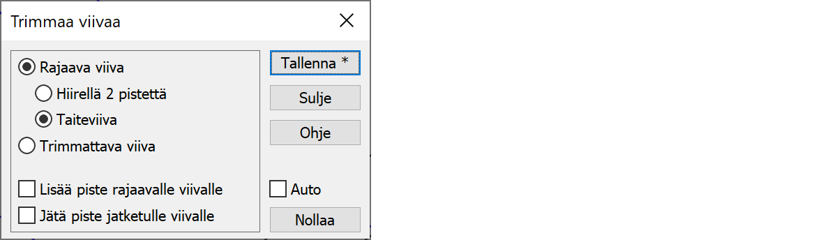 Lisää automaattisesti leikkauspisteen rajaavalle viivalle. Pisteen korko haetaan rajaavalta viivalta. Rastin oltava päällä, kun trimmattava viiva osoitetaan.