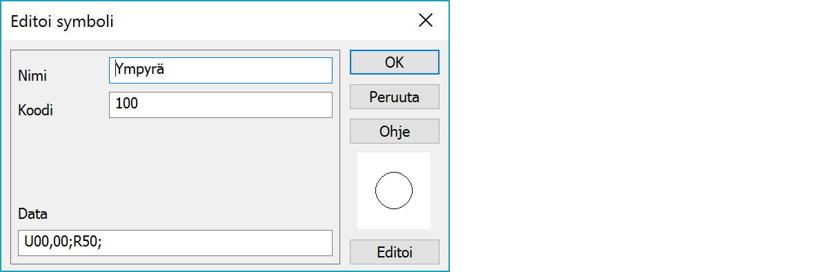 Symbolin piirto. Piirtomääritys voidaan tehdä tässä manuaalisesti. Formaatti on kuvattu kooditiedoston kuvauksessa.